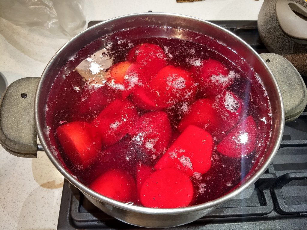 L’acqua si tinge immediatamente dell’incredibile colore sanguigno delle barbabietole, che immancabilmente macchia tutto quello che tocca e fa sembrare la cucina una scena del crimine.