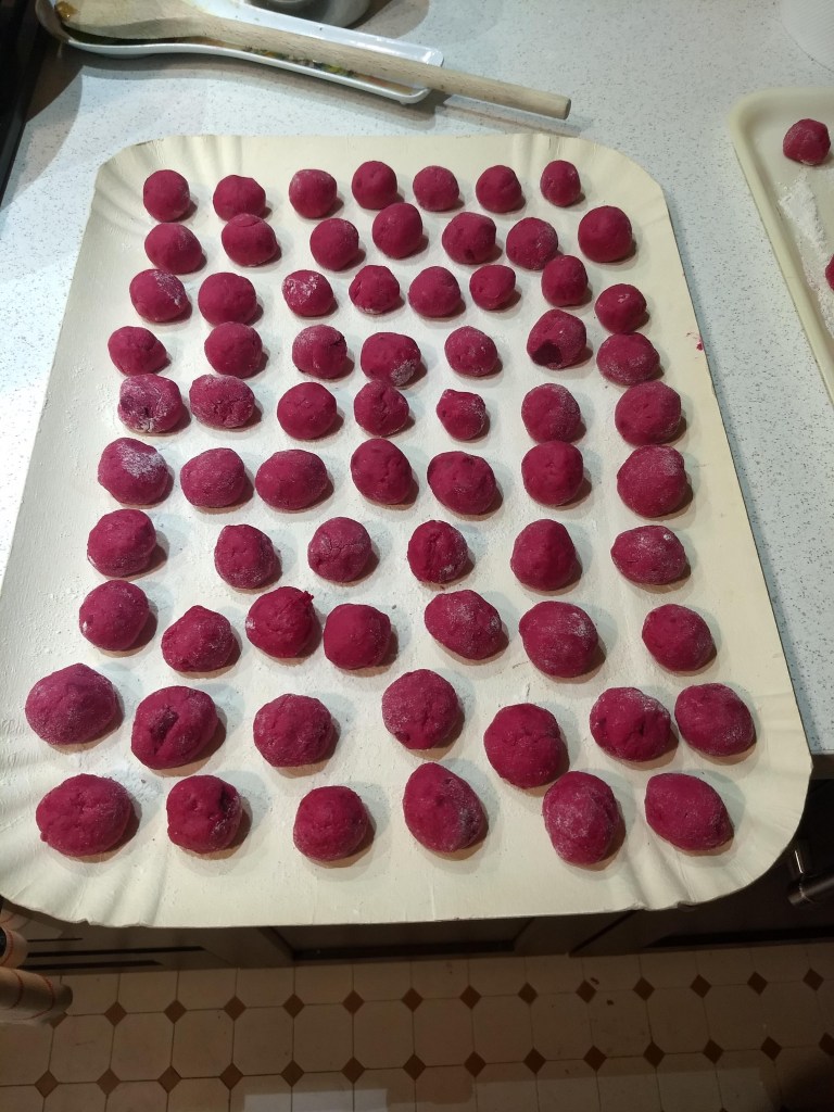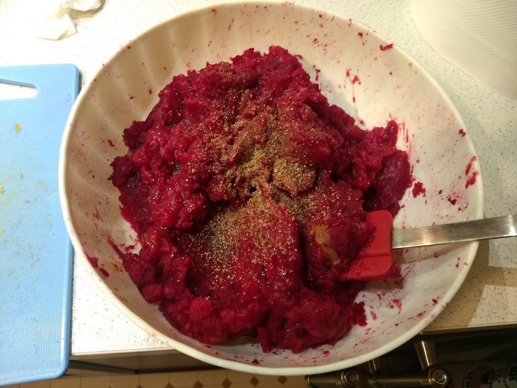 Una volta cotto tutto, scolo l’acqua e mischio le patate schiacciate con le barbabietole frullate, ottenendo un bel miscuglio viola.